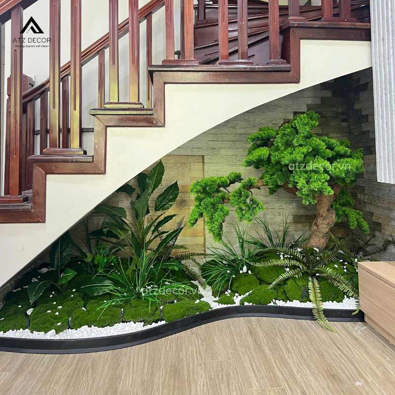 ATZ DECOR thi công tiểu cảnh cây tùng giả gầm cầu thang mang lại sự tươi mới, ấn tượng và không kém phần sang trọng. Tiểu cảnh là sự kết hợp hài hòa giữa cây tùng giả, cây xanh nhỏ, rêu và sỏi trắng. Tất cả được sắp xếp hài hòa, tạo nên diện mạo mới cho góc cầu thang đầy trống trải.